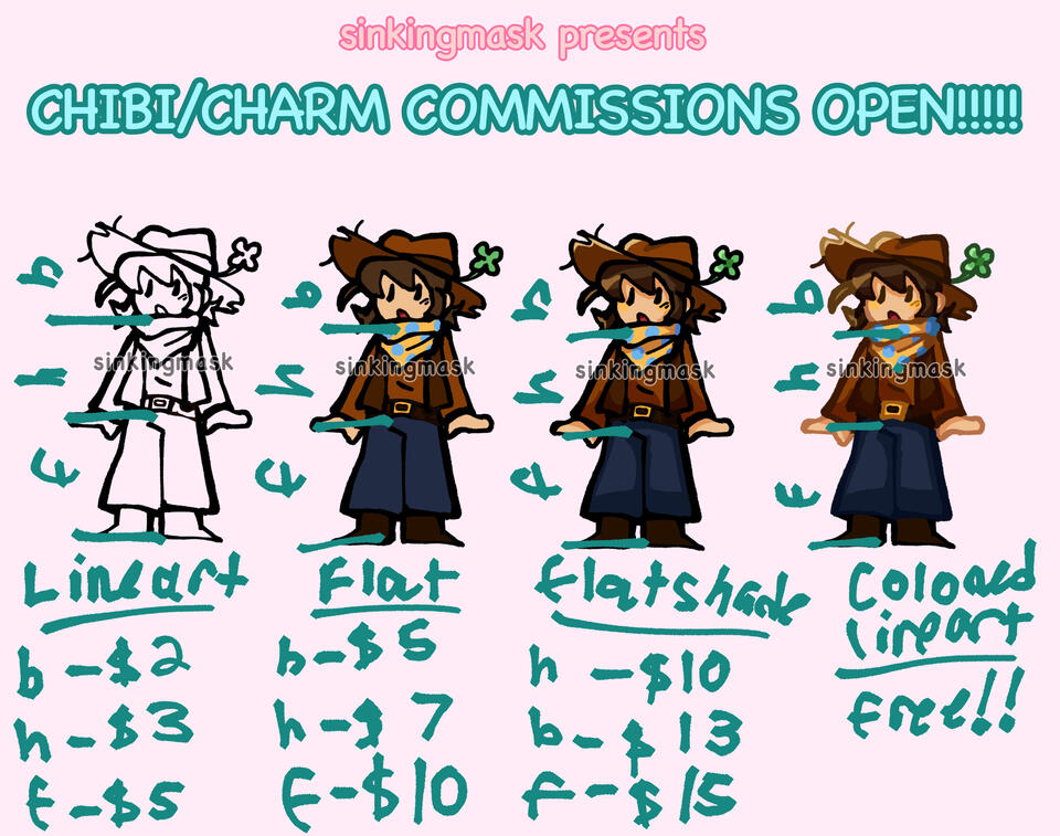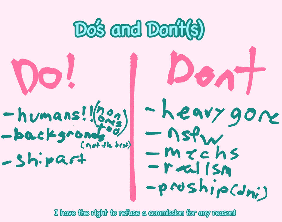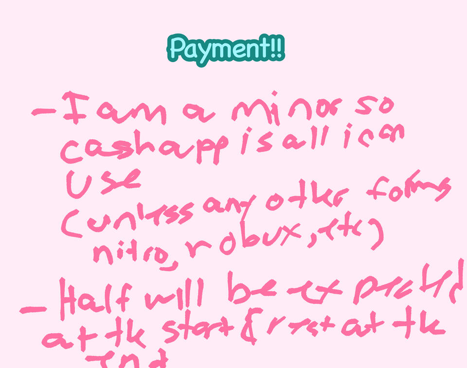 AS OF RN I DO NOT HAVE ANY APPS LIKE CASHAPP OR VENMO IM WORKING ON THAT RN but I take other forms of payment like Discord Nitro or Robux or any sort of gift card!! As long as it is equivalent to the price! That can be talked about when you commissionHalf of the payment will be expected upfront then the rest when I am doneDo keep in mind I am a minor attending school so commissions will not come quick, this is simply a side thing and your commission isn’t my number one priority (although very important)